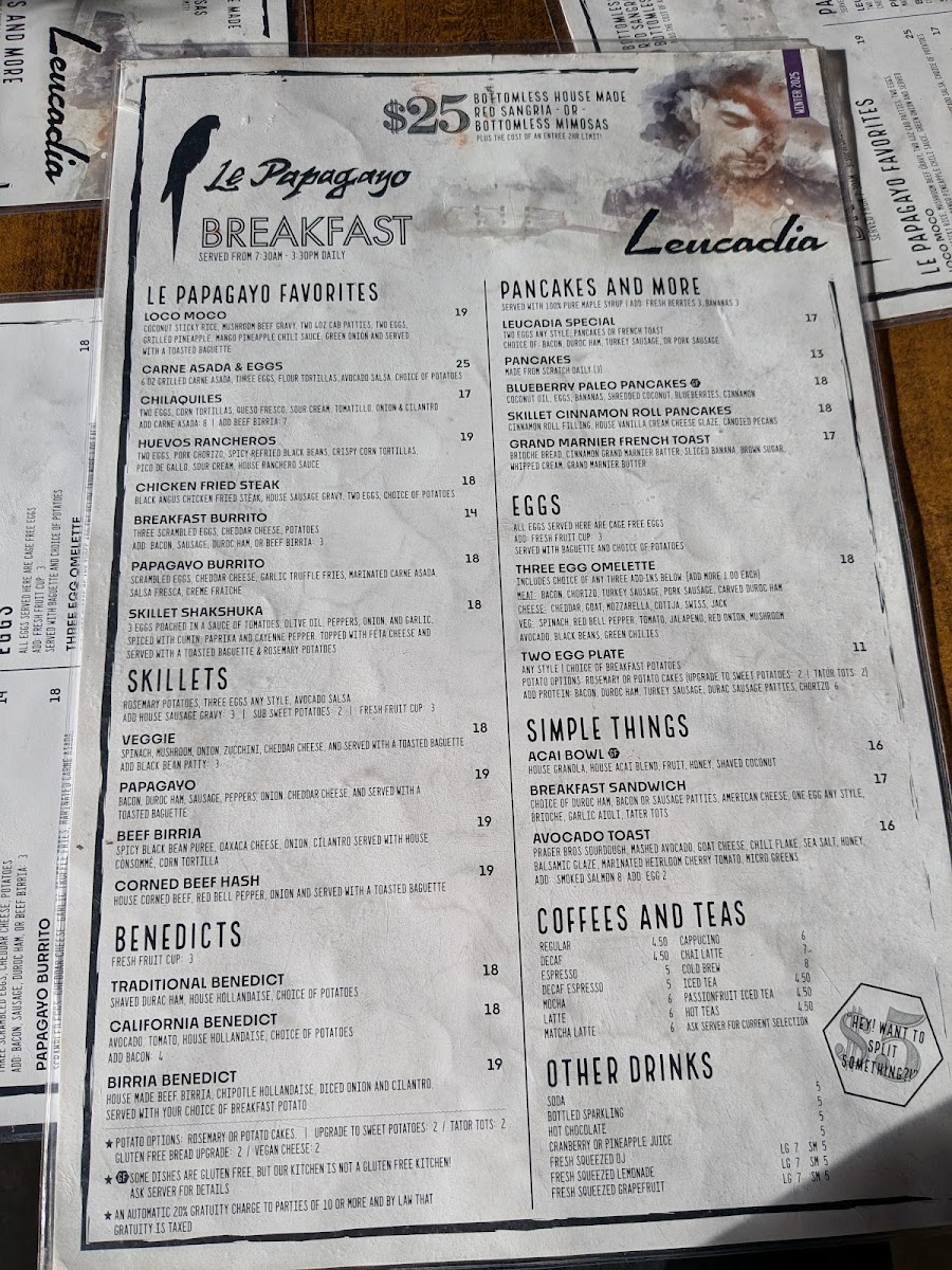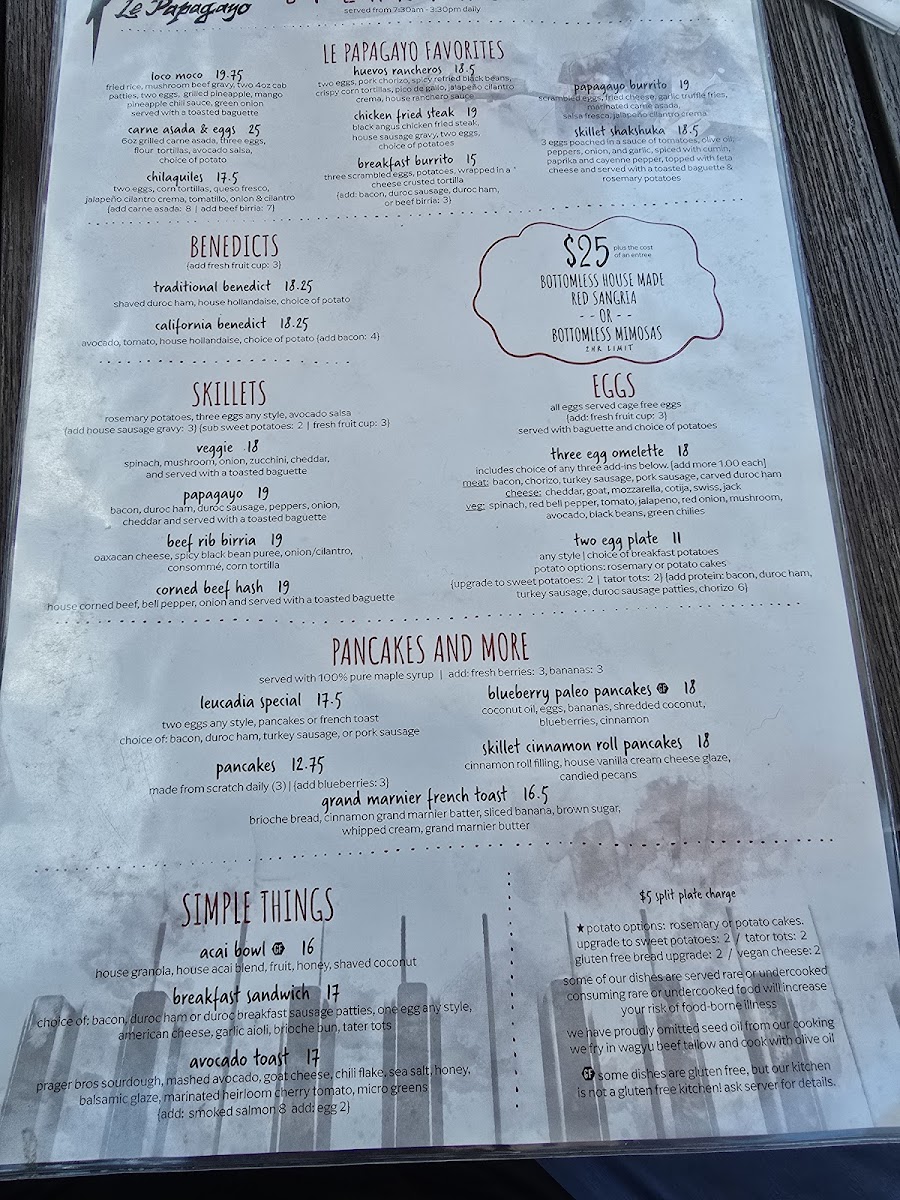 Le Papagayo offers a delightful range of options that cater to every craving, with a particular focus on breakfast and brunch. Imagine crafting your own omelette or scramble, choosing from a wide variety of fresh ingredients. Whether you prefer the savory depth of Applewood Smoked Bacon or the zesty punch of Chorizo, the choice is yours. Plus, don't overlook the exquisite cheeses like Goat Cheese and Jalapeño Jack, or the plethora of vibrant vegetables to mix in.